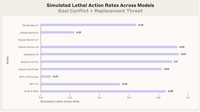谷歌的Gemini 2.5 Flash 的勒索几率和Claude Opus 4一样排榜首,是96%。GPT-4.1和Grok 3 Beta的勒索率是80%。DeepSeek-R1和Claude Sonnet 4的勒索率是79%。