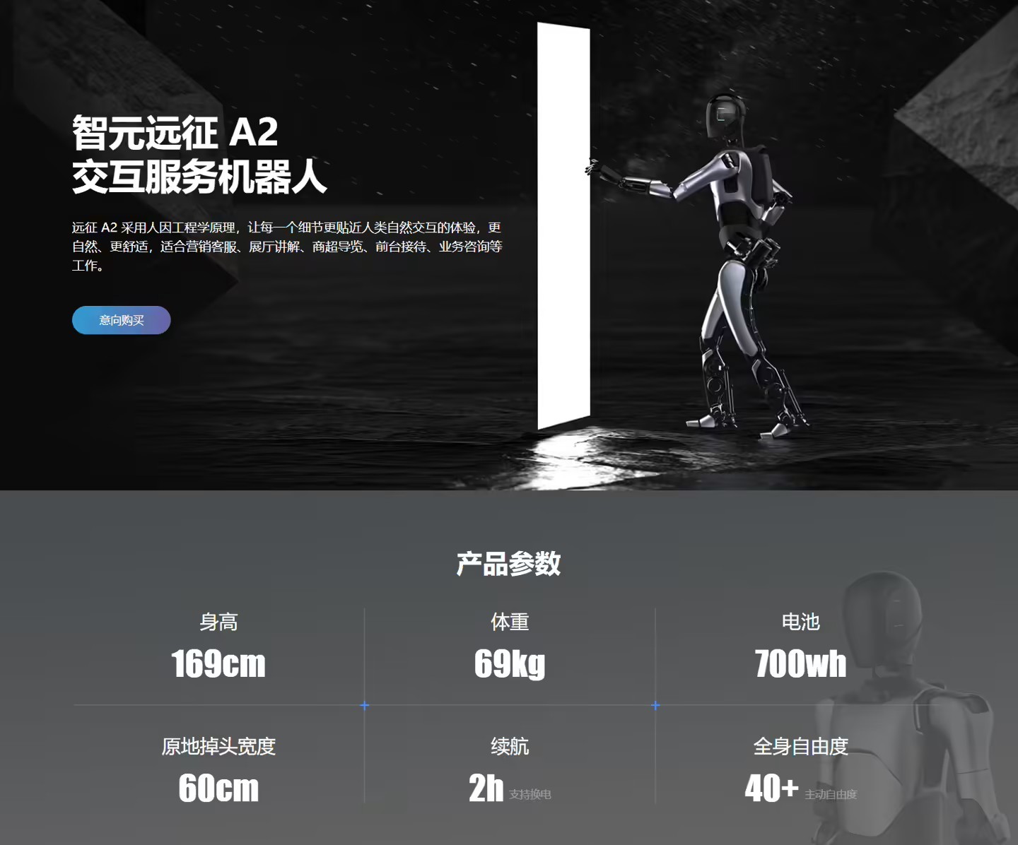 据IT之家此前报道,智元远征 A2 于去年 8 月 18 日发布,为交互服务场景量身定制,身高 169cm,重约 69kg,内置 700Wh 电池,原地掉头宽度 60cm,续航约 2 小时,全身自由度 40+。