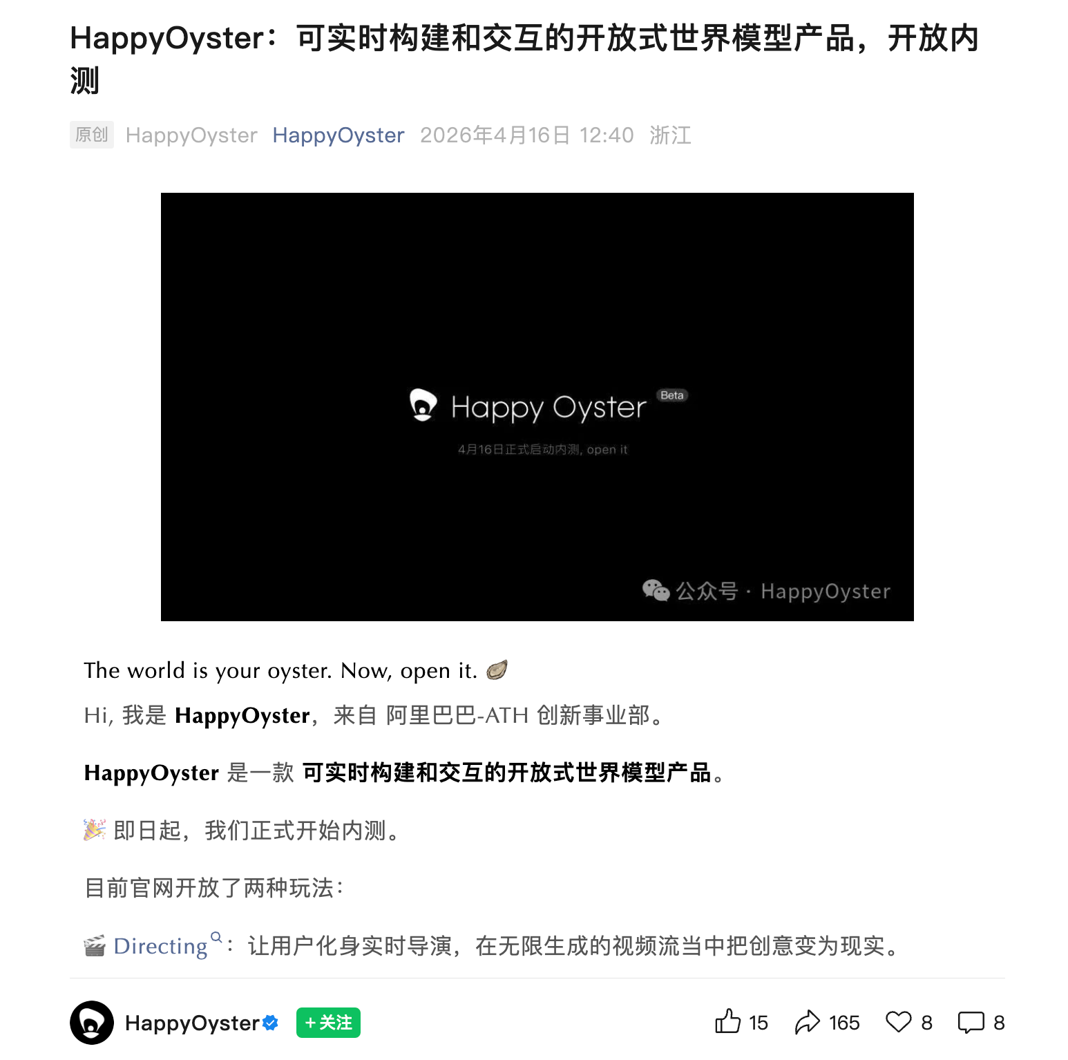 该产品可生成动态三维环境,支持影视制作、游戏开发等场景。其与HappyHorse同属ATH旗下AI创新事业部。目前已开启内测,用户可通过官网happyoyster.cn加入候补名单。