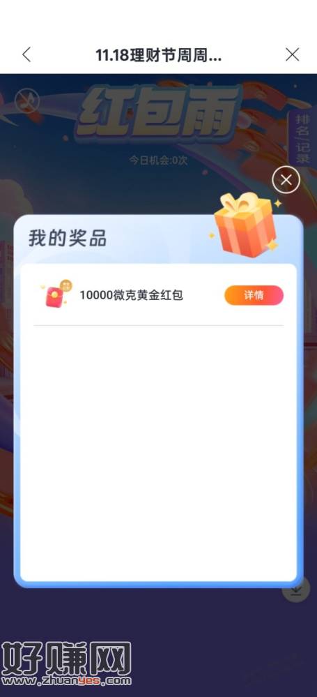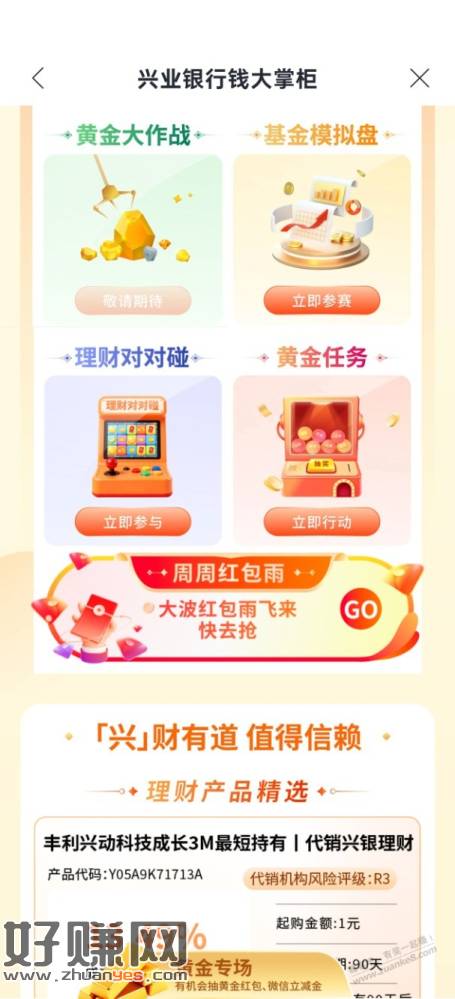 微信扫码,点红包雨跳转到兴业银行手机APP,参加红包雨活动,刚中1万微克黄金,也就是0.01克,目前市值9.16元。活动页面的签到也可以玩,有概率中奖
