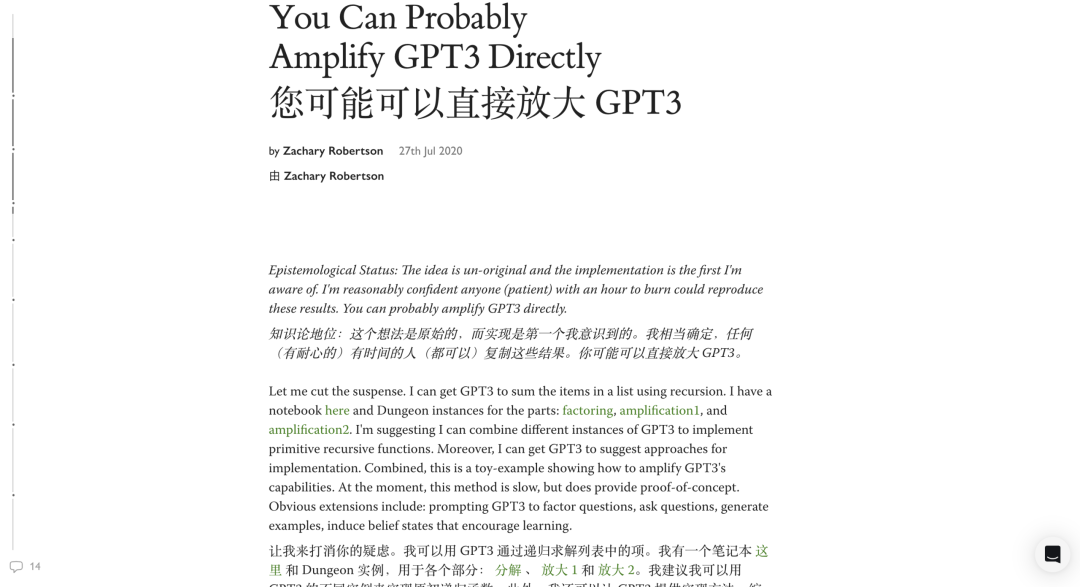 当时还是计算机系学生的 Zach Robertson,同样通过玩《AI Dungeon》接触了 GPT-3,并在 2020 年 9 月在 LessWrong 上发表了博客,详细记录了如何将问题「拆解为多步骤并链接起来」放大模型能力。