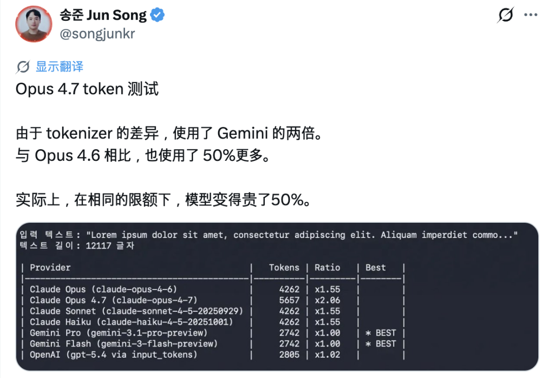 最扎眼的槽点,是 token 先「通货膨胀」了。新版引入了全新的 tokenizer(分词器),同样一段文字,拆出的 token 数量比以前多出 1.0 到 1.35 倍。不少用户反映,还没聊几句,额度就见了底。