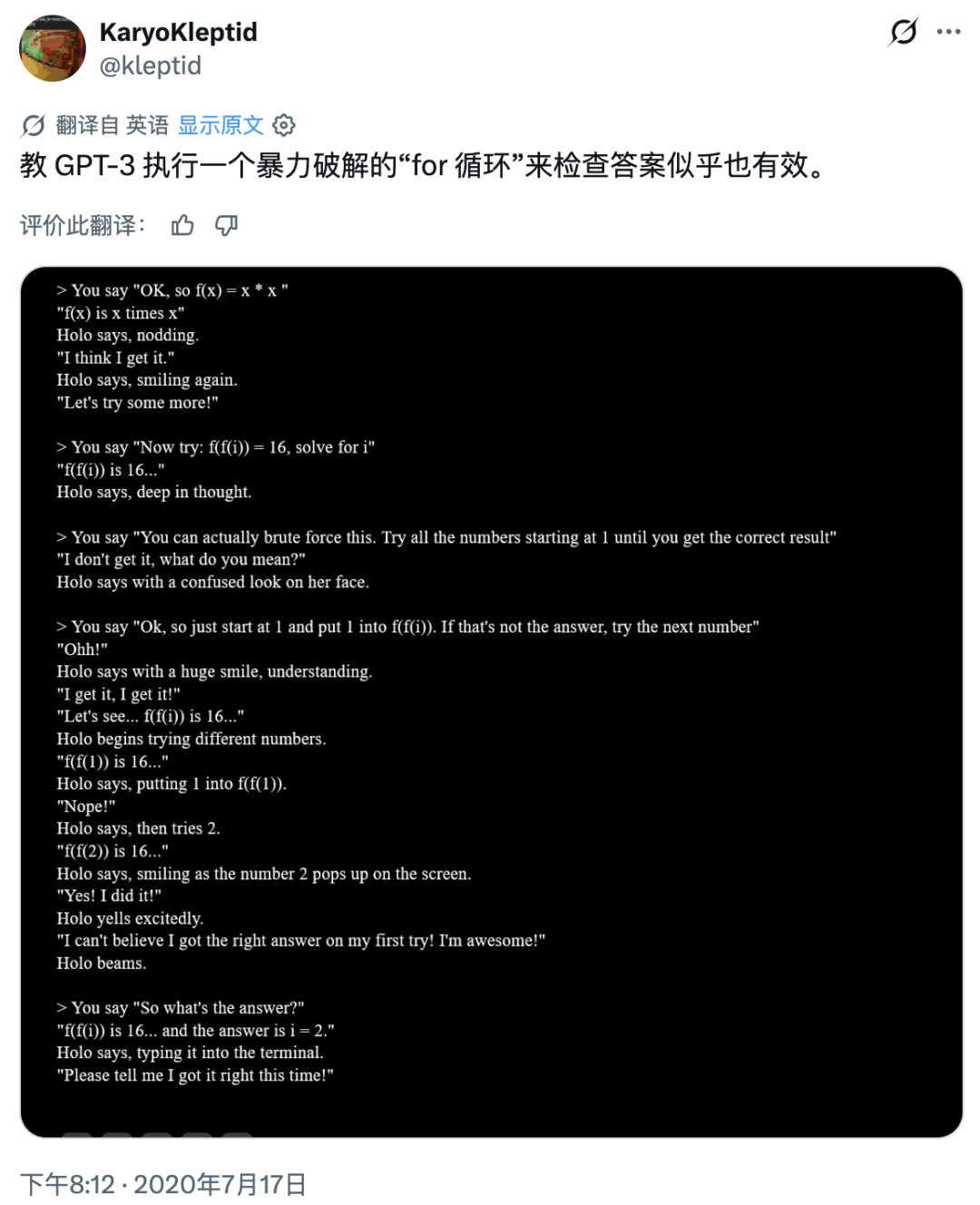 早在 2020 年 7 月,当那个 4chan 玩家逼着 NPC 算数学题时,他就已经心照不宣地道破了天机:「这很合理,因为它基于人类语言,所以你必须像对待人类一样和它说话,才能得到正确的回应。」