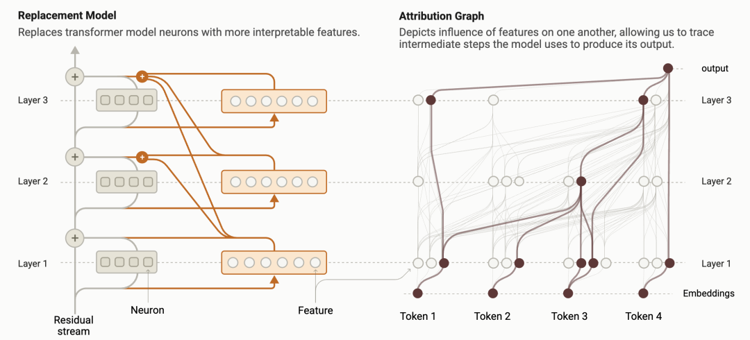 去年,Anthropic 的研究人员开发了一套叫「电路追踪」(Circuit Tracing)的技术,把语言模型内部的计算过程转化为可视化的「归因图」(Attribution Graph):每一个特征节点如何激活、如何影响下一个节点、如何最终影响输出,全都像电路图一样摊开来。