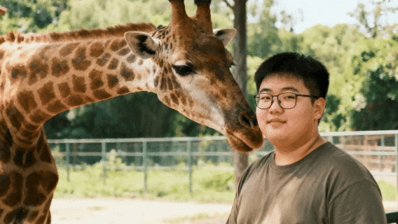 这是我喂给Modify的一张游客照,一个和长颈鹿合影的小男孩,因为拍摄角度的原因,男孩的眼睛显得有点小,皮肤也有些小瑕疵: