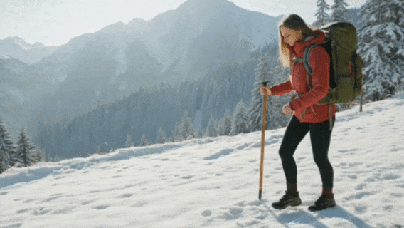 嗯…感觉这身专业户外装备用来登一座普通小山多少有点“杀鸡用牛刀”!于是我让Modify把背景换成积雪覆盖的雪山,这下才对味儿嘛: