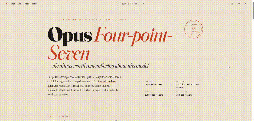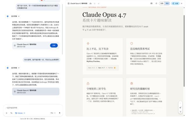 比如,我们找到了官网发布的介绍Claude Opus 4.7 的System Card (相当于模型介绍),把这个232页密密麻麻的PDF文件丢了进去,让它找找这次更新的亮点做成网页。