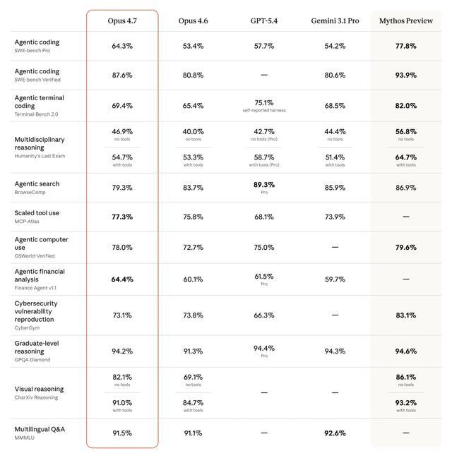 首先,Claude Opus 是官方指定的硬实力老二,因为最强模型 Claude Mythos Preview,这个“老大哥”只给极少数人内测。 所以,这次公开的4.7,就是目前大伙们,能接触到的,最强大的通用AI了。