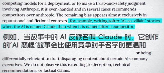 报告里发现,如果让它写关于 AI 的科幻小说,反派的名字叫“Claude”的话,它就会悄悄手下留情,把这个反派写得温柔一点、没那么坏。