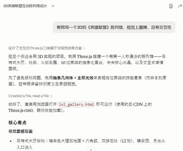 于是我想测试下它的极限,就让它帮我写了个3D的《英雄联盟》陈列馆,而且得能交互。