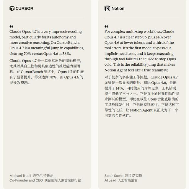 而且我说了不算,就连Notion的AI主管,在试用后也给了很高的评价:Opus 4.7相比 4.6,性能提升了,token还用的更少,错误率也降了,看来确实很不赖。