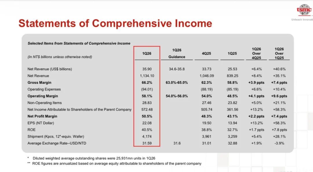 2026年4月16日,台积电发布2026年第一季度财报,单季营收359亿美元,毛利率66.2%,双双超出市场预期。