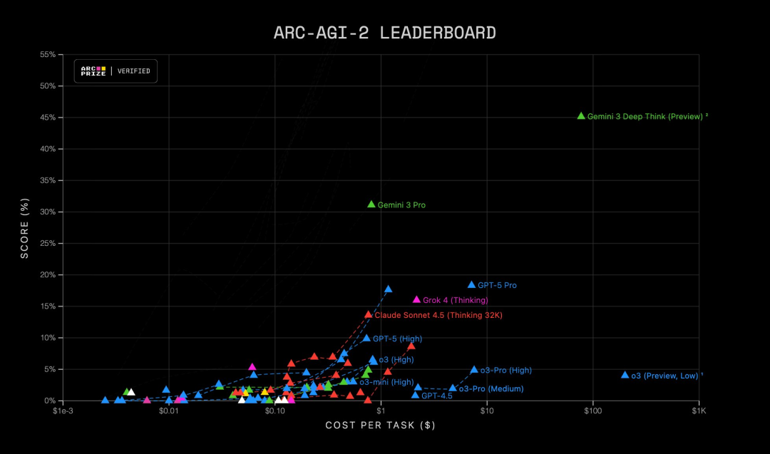 而且,更在ARC-AGI-2(带代码执行,ARC Prize Verified)中创下45.1%历史新高,一展应对未知与新颖问题的强大能力。