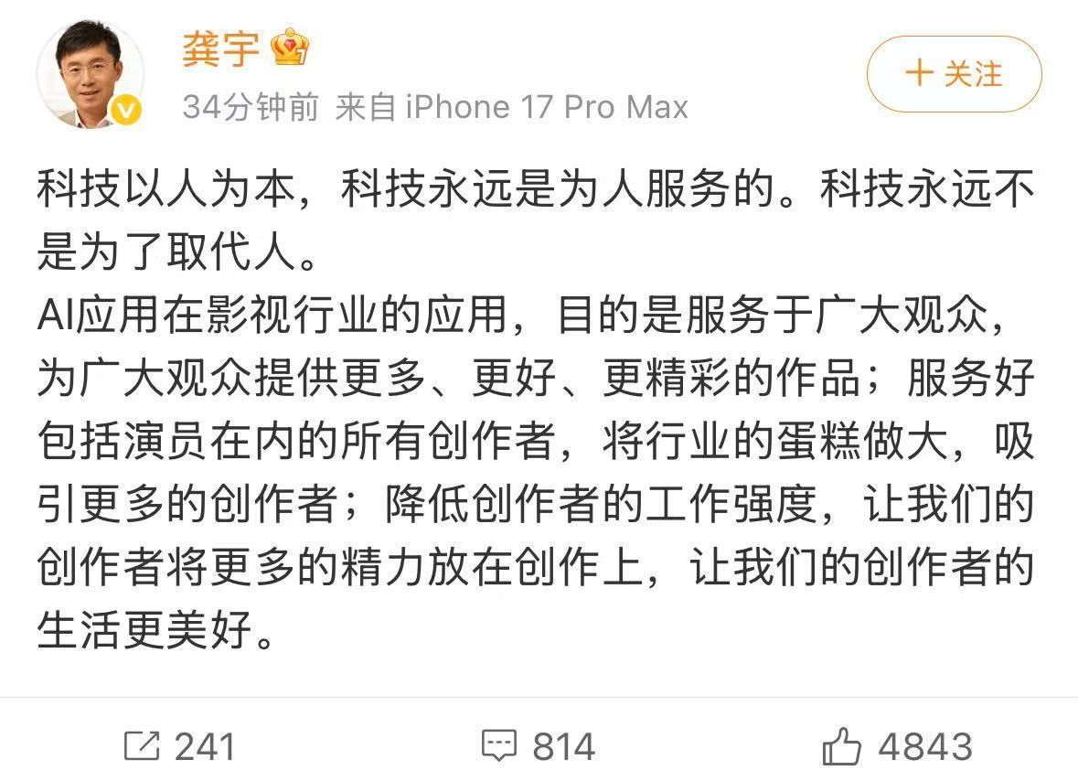 凤凰网科技讯 4月21日,爱奇艺创始人、CEO龚宇发文谈AI在影视的应用。他表示:科技以人为本,科技永远是为人服务的。科技永远不是为了取代人。AI应用在影视行业的应用,目的是服务于广大观众,为广大观众提供更多、更好、更精彩的作品;服务好包括演员在内的所有创作者,将行业的蛋糕做大,吸引更多的创作者;降低创作者的工作强度,让我们的创作者将更多的精力放在创作上,让我们的创作者的生活更美好。