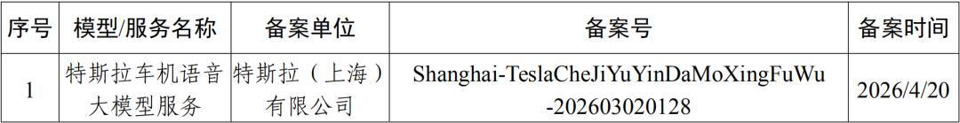 备案信息显示,特斯拉车机语音大模型服务于 4 月 20 日备案,备案单位为特斯拉(上海)有限公司。
