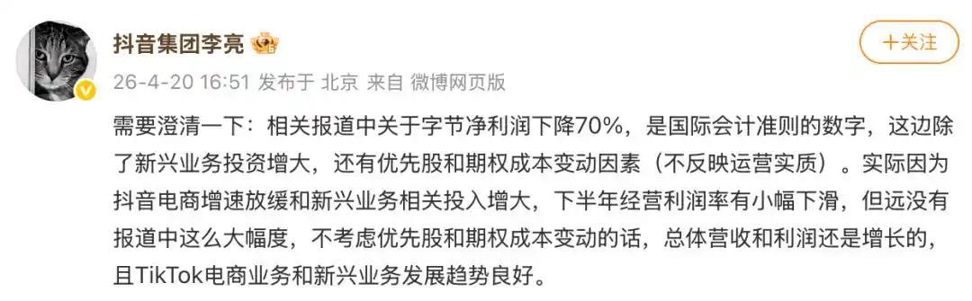 图注:报道后,抖音副总裁对字节跳动的净利润下滑做了回复。