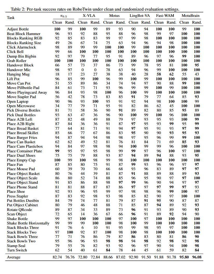 而在更偏任务执行的 RoboTwin 上,这种优势被进一步放大。面对 50 个任务、两种不同环境设置,MotuBrain 的平均得分达到 96.0,显著高于第二名的 92.3,领先幅度几乎等同于第二名到第五名之间的差距。