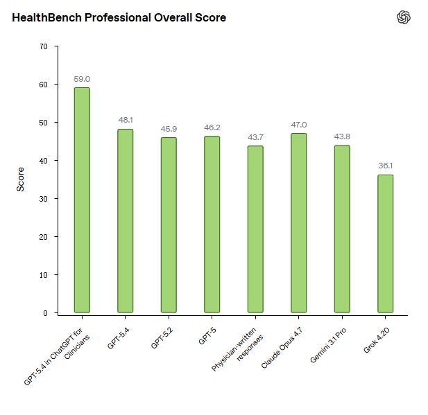 OpenAI 通过 ChatGPT 报告临床医生及跨模型的结果。作为一个强有力的基础,OpenAI 要求人类医生在其专科内,拥有无限时间和网络访问,自行生成回答。OpenAI 发现,ChatGPT for Clinicians 工作空间中的 GPT-5.4 表现优于基础 GPT-5.4、所有其他 OpenAI 和外部模型,以及人类医生。