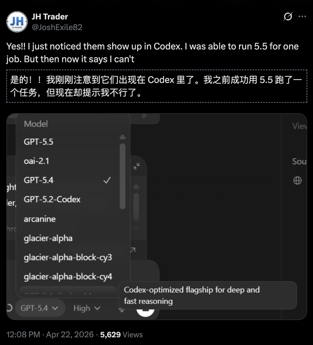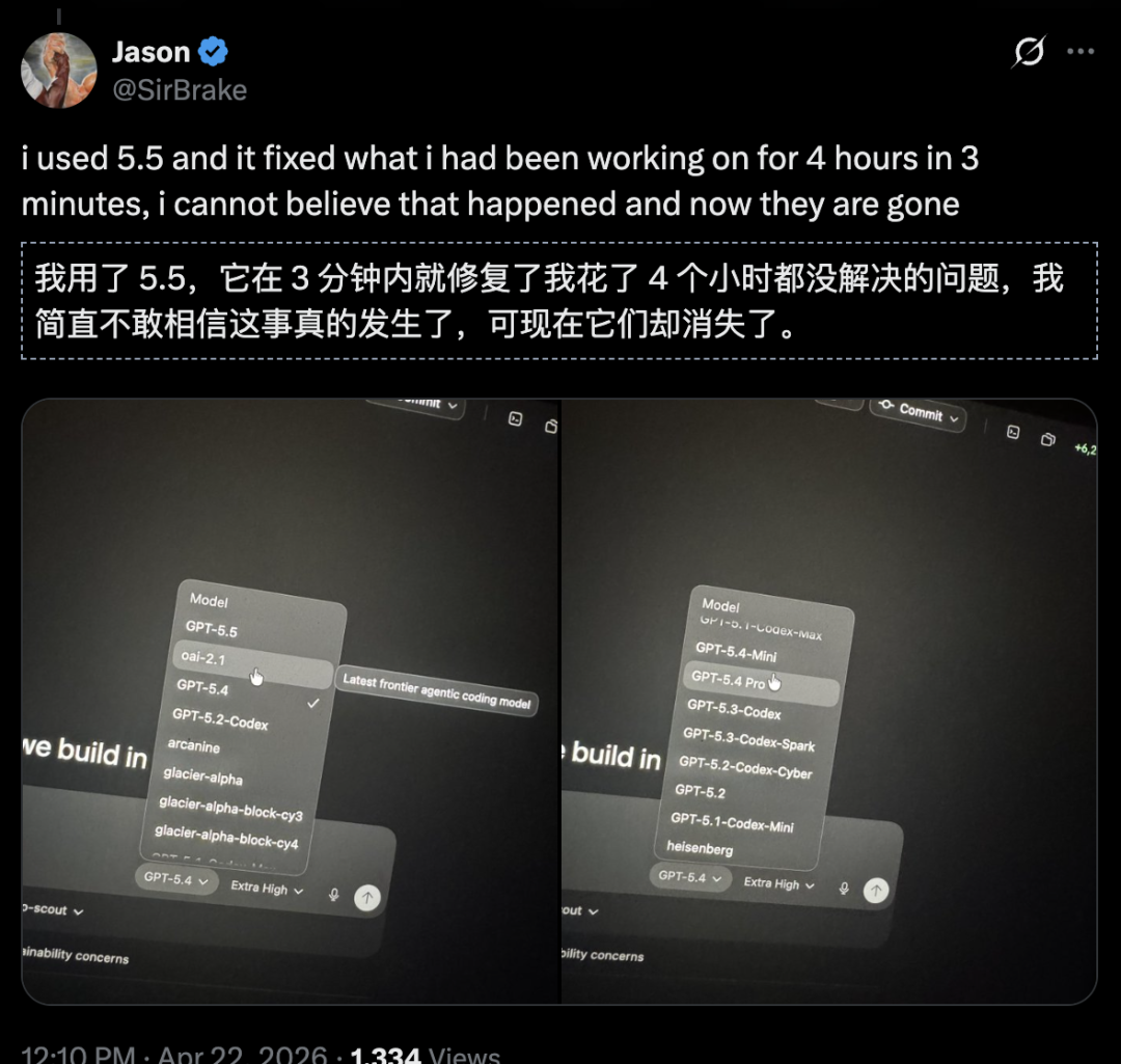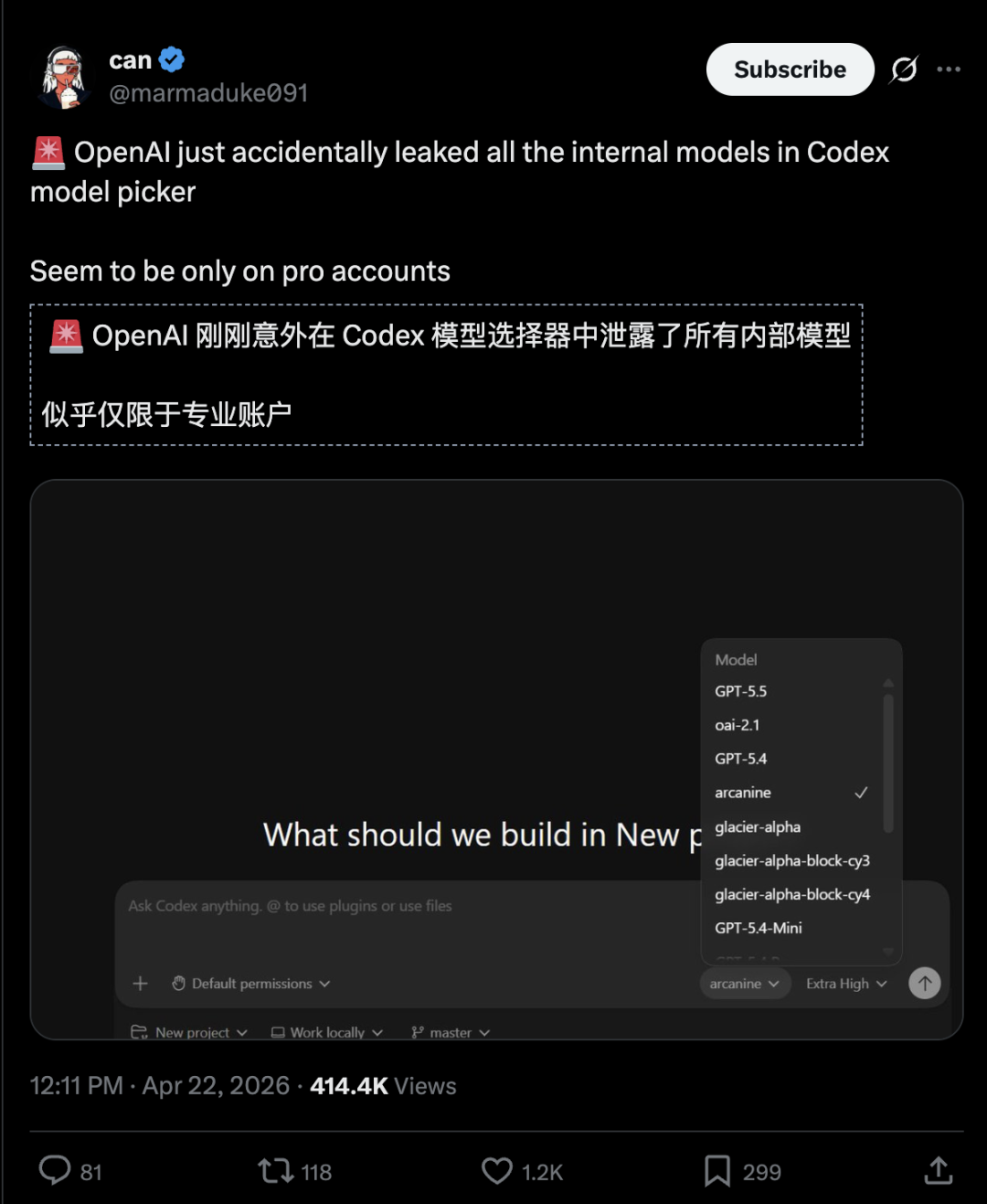 【新智元导读】就在刚刚,Codex平台爆发重大泄漏事故,内部测试环境疑似误推生产环境。GPT-5.5、「风速狗」Arcanine、「海森堡」以及神秘的Glacier集体亮相。奥特曼口中那个「比Transformer更伟大的架构」,难道已经藏在这些模型背后?