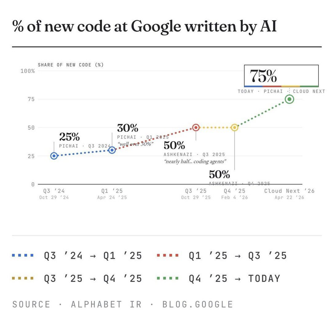 去年秋天这个数字还是50%,半年时间,暴涨了25%。U1S1,比起Anthropic 100%代码AI写,谷歌还是差了些。