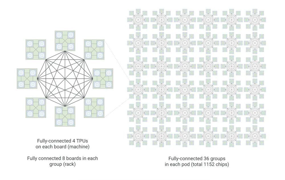 它由四个全连接芯片组成的基础构建块,向上发展为八个主板的全连接组,其中36个组再全连接成一个TPU 8i pod。