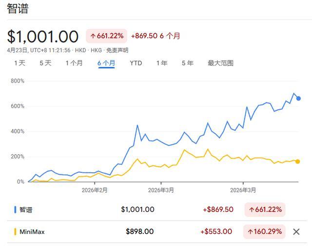 智谱和MiniMax于2026年1月先后登陆港股,此后股价一路飙升,截至4月23日累计涨幅约5-8倍。其中,智谱从116.20港元上市价格,涨到1001港元。它们是目前全球仅有的两家纯前沿AI大模型上市公司,稀缺性本身就是溢价。