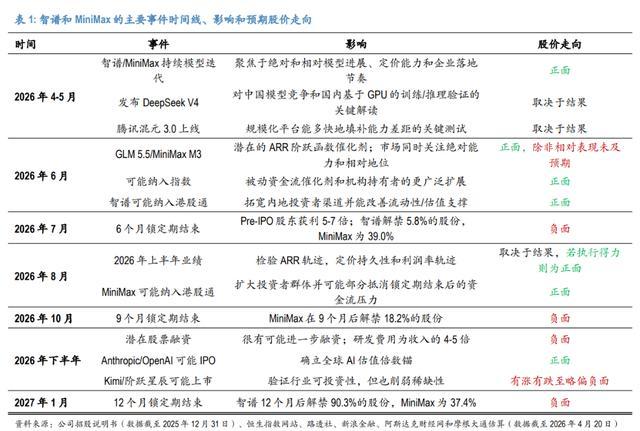 MiniMax:7月初解禁39.0%,10月前后再解禁18.2%,2027年1月解禁37.4%。2026年下半年的供给压力明显更大。