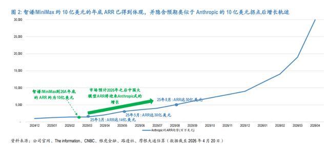 摩根大通的测算是:市场已经隐含智谱2026年底ARR(年化经常性收入)约达10亿美元,MiniMax约达7亿美元。