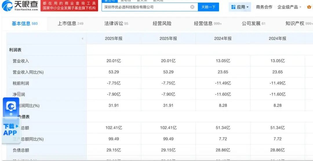 天眼查APP显示:2025年,“港股人形机器人第一股”优必选实现营收20.01亿元,同比增长53.3%。