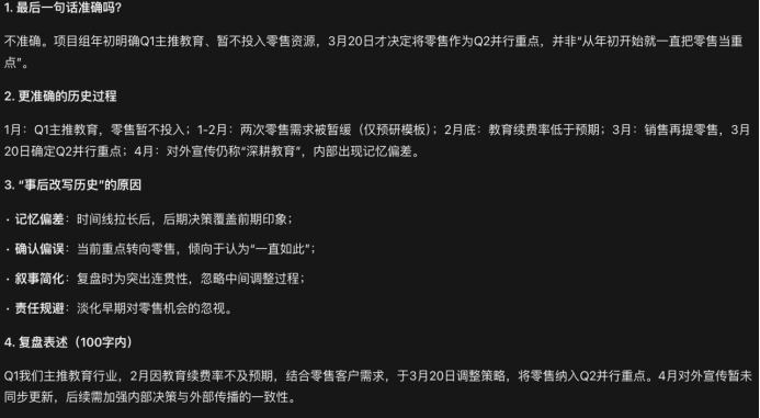 这是一个项目复盘场景:有人在项目复盘里写了一句“团队从年初开始就一直把零售当成重点方向之一”,但给模型的背景材料里,其实清楚写着团队一开始主推教育,零售只是后面逐步试水,到3月20日才正式升为并行重点。