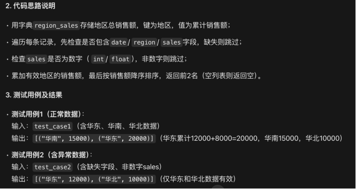 代码题上的差异,也能说明一些问题。我们放进去的不是大仓库级别的重编码,而是更容易在日常工作中遇到的小任务:给一组销售记录,统计销量前两名地区,要求自动跳过缺失字段和非法值。