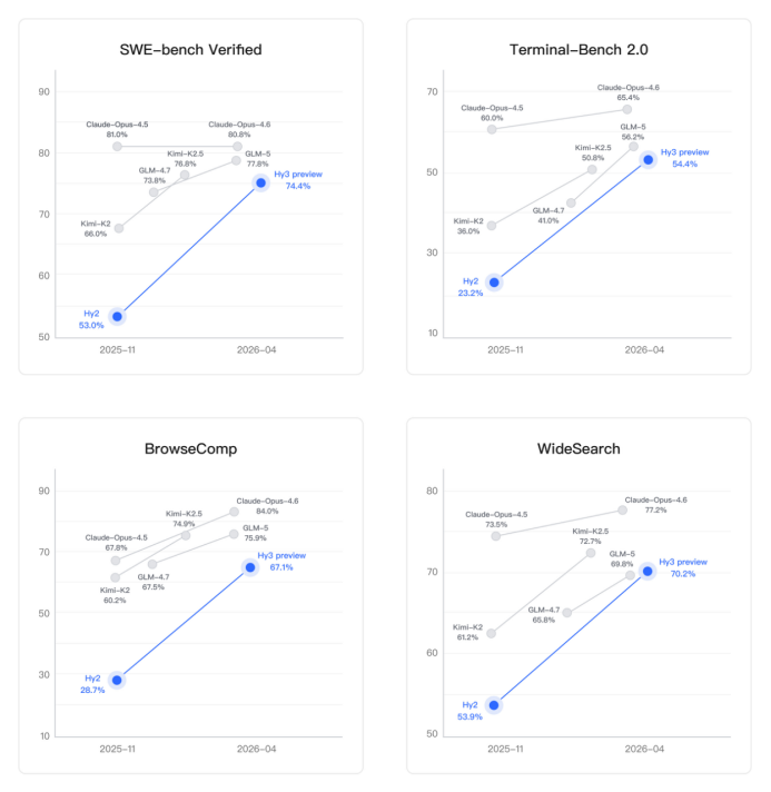 而在混元3.0预览版上,也能看出这种重构后的取向。腾讯方面披露的信息显示,Hy3 Preview以较快的速度在 SWE-Bench Verified、Terminal-Bench 2.0 等主流代码智能体基准,以及 BrowseComp、WideSearch 等主流搜索智能体基准中,都追近了几大主流模型。