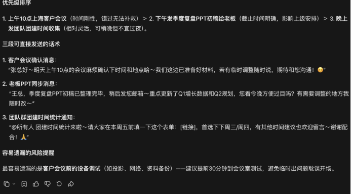 另一类是“任务推进能力”的考量。模型需要在在三件事里排优先级:上午10点上海客户会议、下午交季度复盘PPT初稿、晚上发团建时间收集通知,并要求它顺手把三段消息都写好。