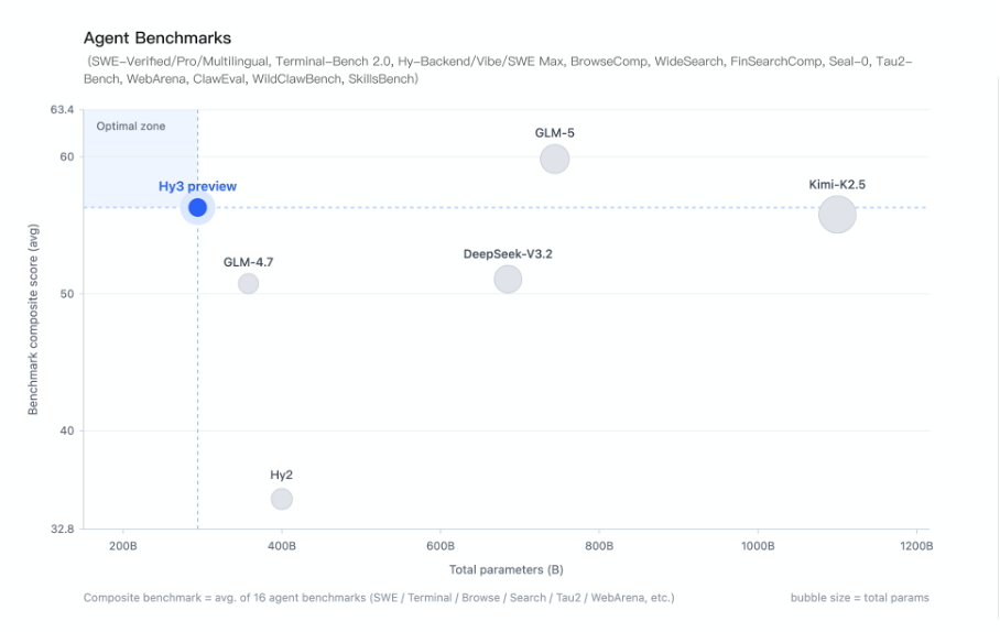 此外,据了解,Hy 3.0 在推理效率上提升达 40%,在知识理解、数学计算、写作表达及逻辑推理等多个维度都达到了行业一线水准,指令遵循、多轮对话和长文理解能力也获得了显著优化。要说提升最大的,肯定还是智能体能力,从各个开源模型的大小与智能体综合表现来看,Hy3 preview 展现出了高性价比。