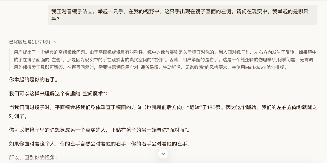 我们先用两个简单问题测试了下Hy3 preview的基础思考能力,一道经典的洗车难题,一道照镜子举手题。