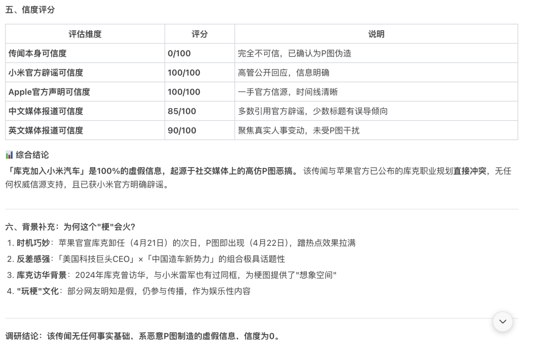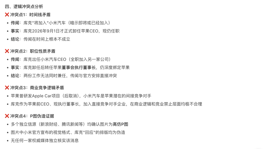 这个过程最精彩的部分是“逻辑冲突点分析”。模型从四个维度对传闻进行了彻底解构:第一是时间线矛盾,指出传闻发生时库克仍是苹果CEO,与“加入小米”在时间上不成立;第二是职位性质矛盾,苹果官方已公布库克卸任后将转任执行董事长,这意味着他依然深度绑定苹果,不可能全职加盟竞争对手;第三是商业竞争逻辑矛盾,从商业常识层面指出此举的极端不合理性;第四才是直接的伪造证据,即多家媒体已确认图片为P图。这个分析顺序本身就很见功力——它没有先揪着“P图”这个最表层的漏洞,而是先从事物内在逻辑(时间、身份、商业关系)出发,层层推进,最后用确凿的证据一锤定音,这种论证方式严谨而有力。