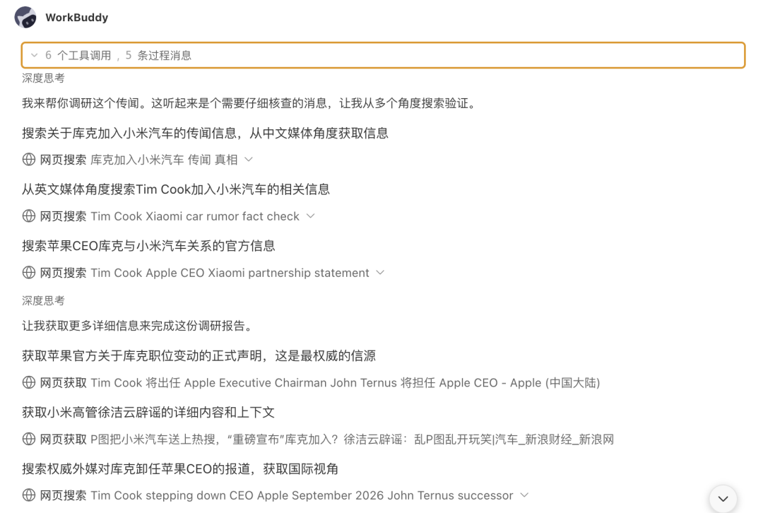随后,模型在 WorkBuddy 环境中开始了系统性的信息搜集。在接下来的几分钟里,它自主发起了六轮工具调用,每次都有明确目标。它先并行搜索了中英文媒体对此事的报道,以获取事件概览;紧接着并没有停留在媒体层面,而是直奔问题核心信源,打算拿到苹果官方的声明和小米高管的直接辟谣内容。