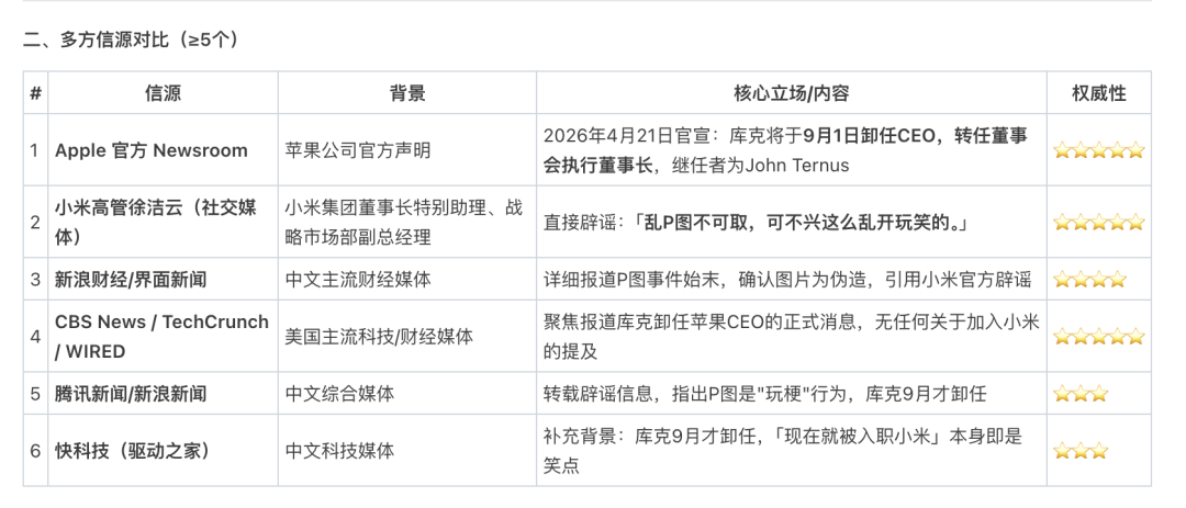 信息搜集完毕后,真正的智能才开始显现。我们在 WorkBuddy 中看到的不是一堆杂乱的网页摘要,而是一份结构清晰、论证严谨的调研报告。报告先通过一张“多方信源对比表”,把苹果官方、小米高管、中外权威媒体等超过五个信源的信息、立场和权威性评级直观呈现出来,给了用户一份证据的“权重地图”。