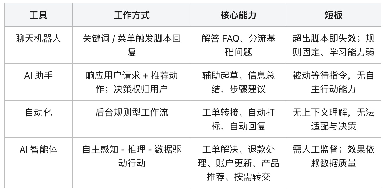 AI 智能体则全面超越三者,自主且主动完成任务。从回答 “订单状态”,到查询订单、同步状态、推送通知,甚至发现未支付购物车并跟进,从 “应答” 到 “行动”、从 “被动” 到 “主动”,这是核心跃迁。