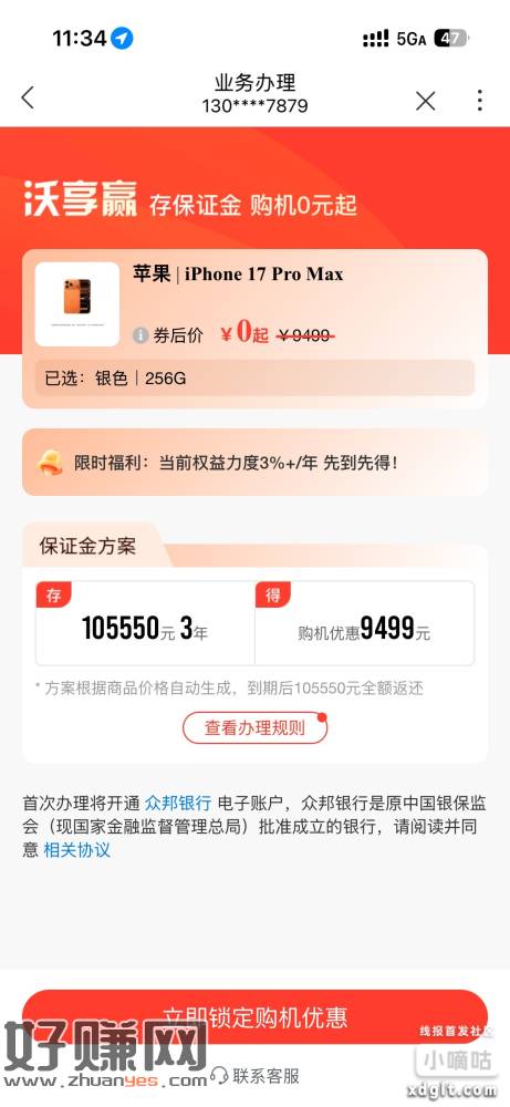 格局车,联通手机营业厅存10万3年,送17promax,到期无损取出10w ,自测