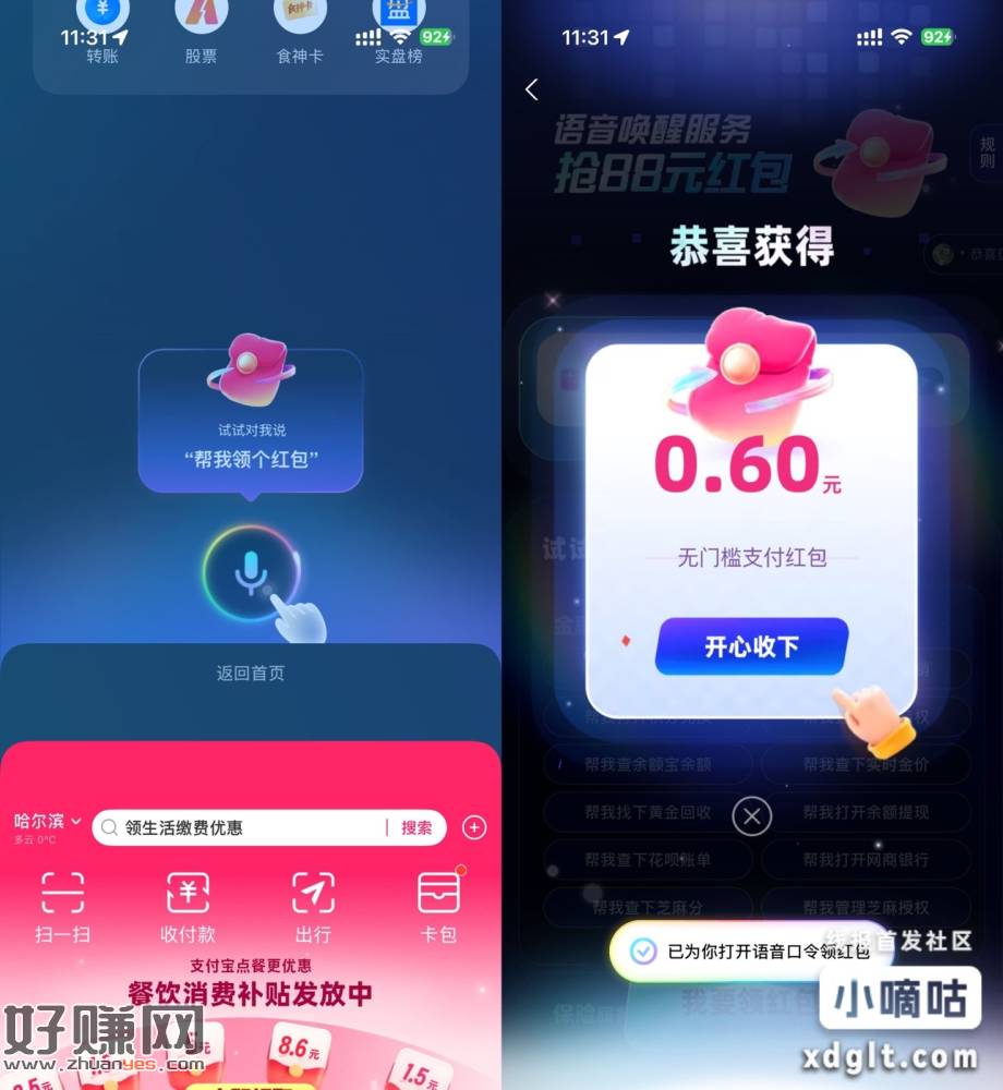 【支付宝语音唤醒每天得1亓红包】支付宝首页下拉->根据提示说话得红包->多说几次有1亓左右,每天都可参与