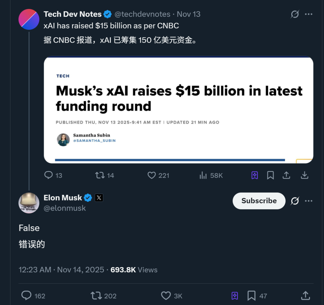 从上次到这次,xAI曝出的融资都是150亿美元,估值也都差不多,其真实性目前确实大打问号。