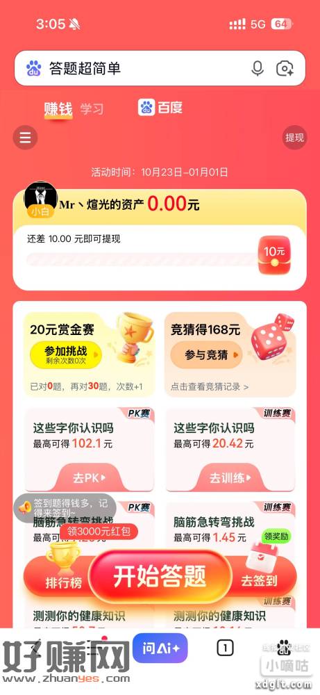 今晚加马,记得玩,百度搜:【答题超简单】 p1 是题库20:00,19:56进,最后一题卡,20点整提交20:15,20:11进,最后一题卡,20:15整提交20:30,20:26进,最后一题卡,20:30整提交卡点最后一题提jiao现在都是卡点 简单模式是顺序一样300,秒如果不是关掉重复答题挑战王进,点击“参yu挑战”超简单模式样式长这样 ,不一样的话重进