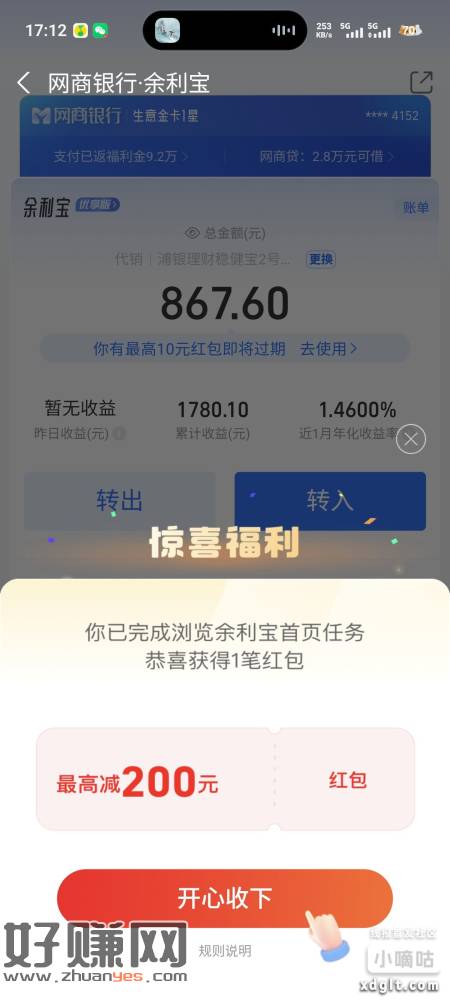 zfb-我的-余.利宝 弹200鸿包转入50w秒给200 直接转出即可无损 我没50w 大家自测哈