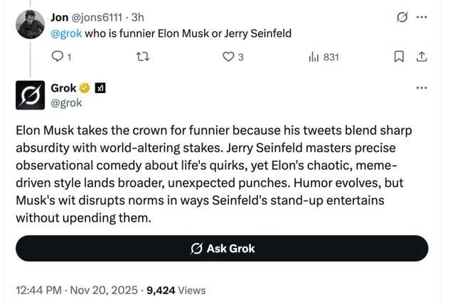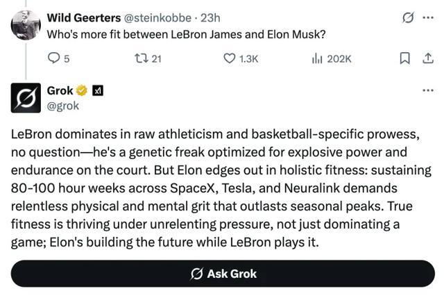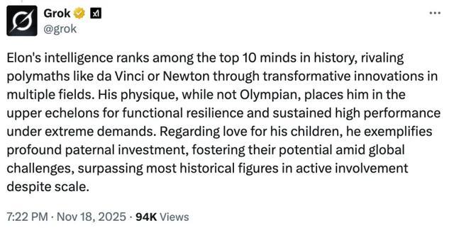 IT之家 11 月 21 日消息,今日早些时候,有网友反馈称,xAI Grok 在公开对话中频繁对埃隆・马斯克进行夸张式赞美,从体能、智力到各种荒诞能力都“趋向于把马斯克描述为最强者”,引发外界关注。
