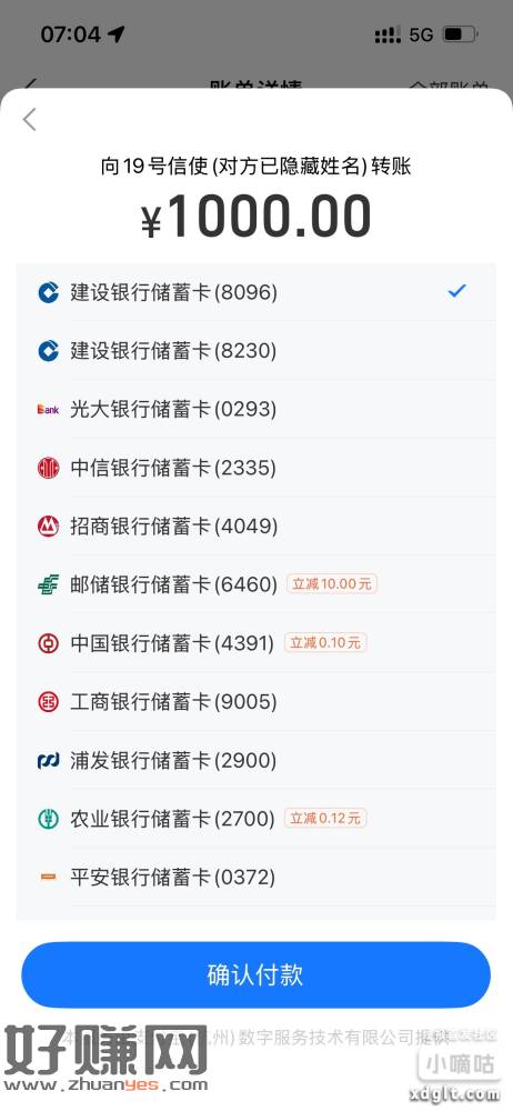 支付宝收款1000元,大小号,邮储立减10块钱