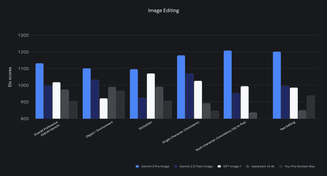 基准测试中,新版Nano Banana相较于上一代性能显著提升,GPT-Image、Flux Pro Kontext Max根本无法相提并论。
