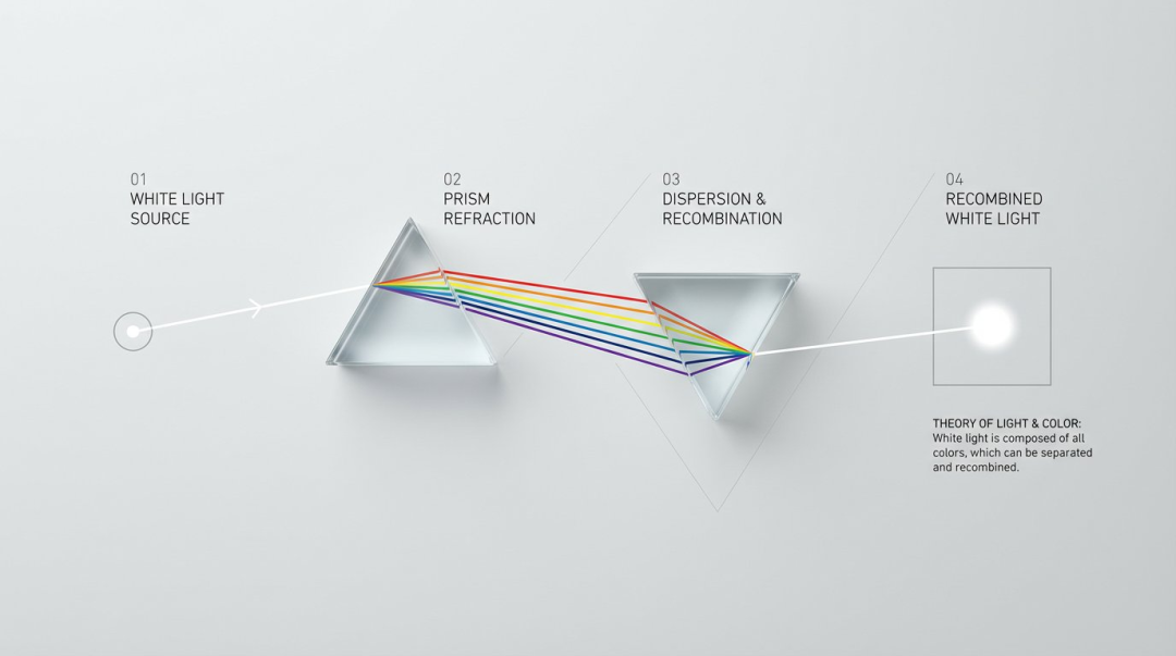 再比如,它可以直出白光通过三棱镜被分解成彩色光,又通过第二个三棱镜重新组合成白光的过程。