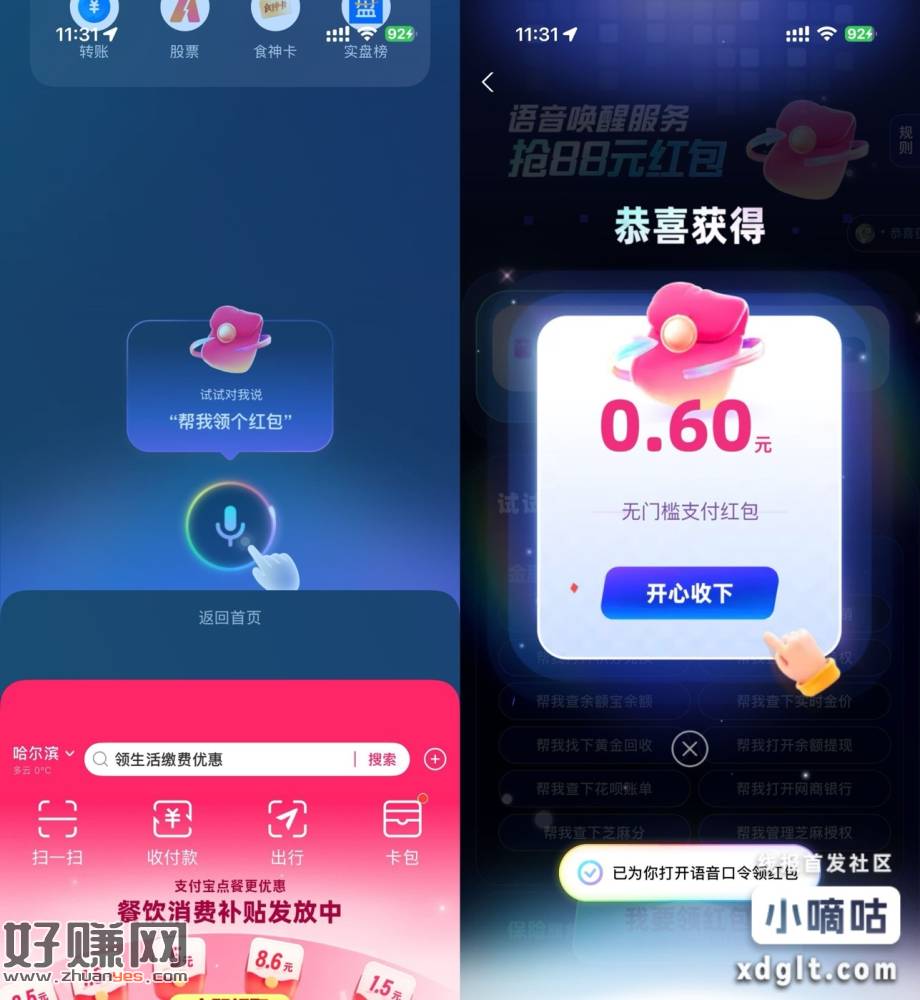 zfb语音唤醒每天得1亓鸿苞zfb首页下拉->根据提示说话得鸿苞->多说几次有1亓左右,每天都可参与哈