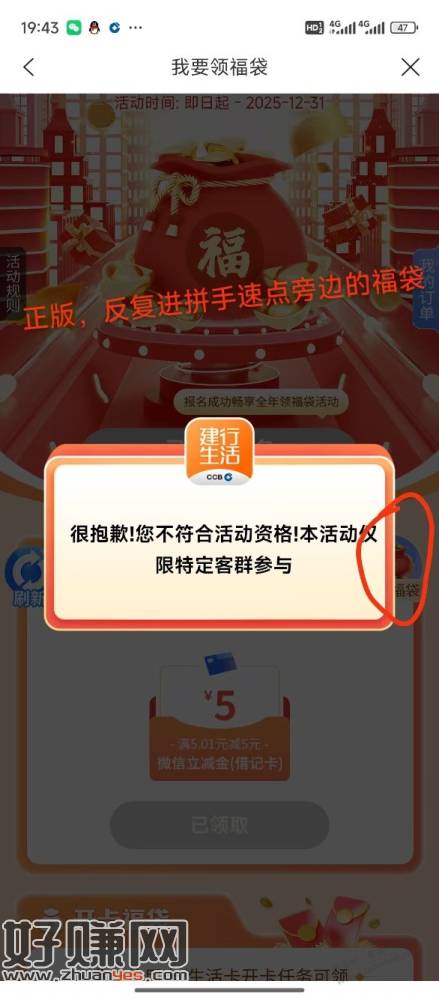 建行生活用幻影定南京 分身先支付领到福袋。 接着去正版建行 拼手速点进去领。 进去之后反复领几次。能领2张5